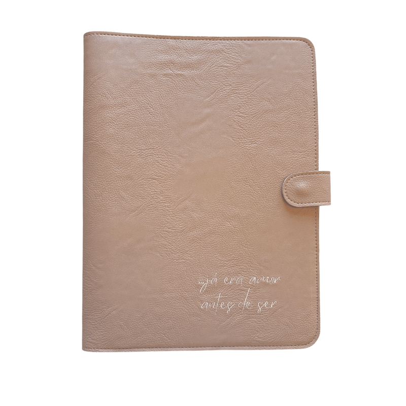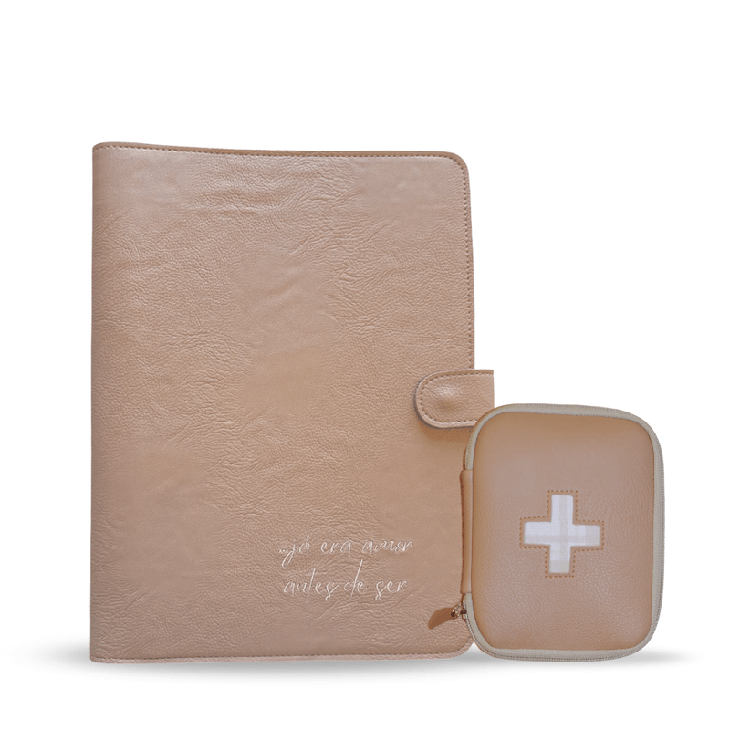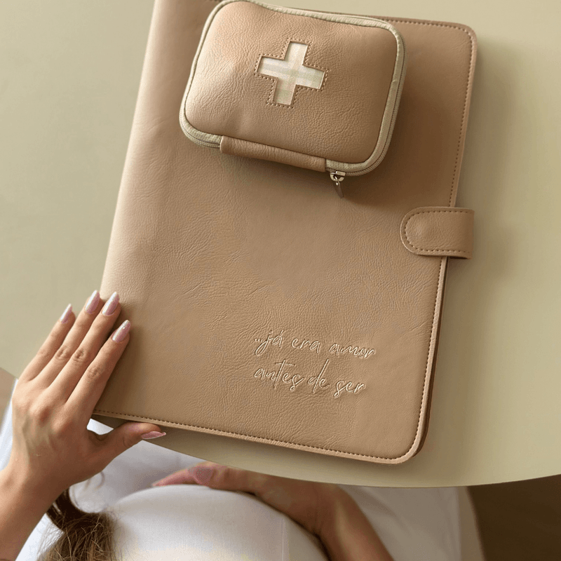 Pasta perfeita para exames e documentos da gestante durante e após o pré-natal. Feita em couro ecológico grosso sem origem animal, com frase "...já era amor antes de ser" bordado.