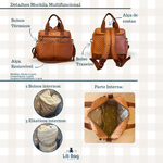 Esta mochila é confeccionada com tecido 100% poliéster e possui um forro 100% algodão, garantindo durabilidade ao produto. Seus detalhes são feitos em couro sintético para assegurar qualidade e elegância. A alça transversal, larga e removível, proporciona conforto ao carregá-la no ombro, e o forro de nylon resinado facilita a higienização da bolsa.