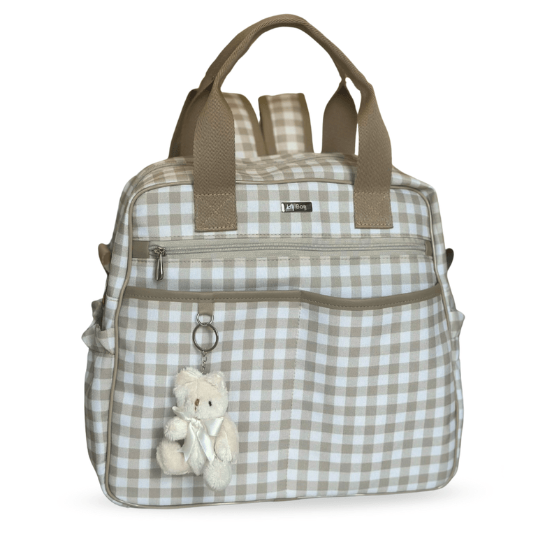 Esta mochila é confeccionada com tecido 100% poliéster e possui um forro 100% algodão, garantindo durabilidade ao produto. Seus detalhes são feitos em couro sintético para assegurar qualidade e elegância. A alça transversal, larga e removível, proporciona conforto ao carregá-la no ombro, e o forro de nylon resinado facilita a higienização da bolsa.O que acompanha a Mochila Multifuncional?