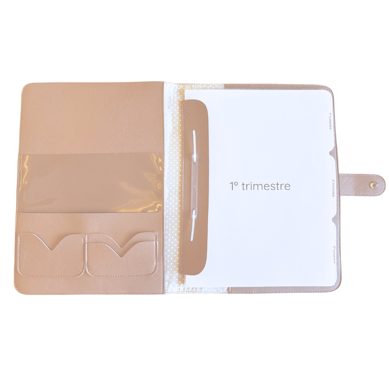 A pastinha completa, perfeita para exames e documentos da gestante. Essencial para quem deseja viver a gestação com mais leveza e praticidade, a Pasta Gestante foi criada para manter todos os documentos e exames organizados em um só lugar, desde o primeiro ultrassom até o plano de parto. Produzida em couro ecológico grosso, alia elegância, resistência e consciência, respeitando a preocupação com a origem animal.