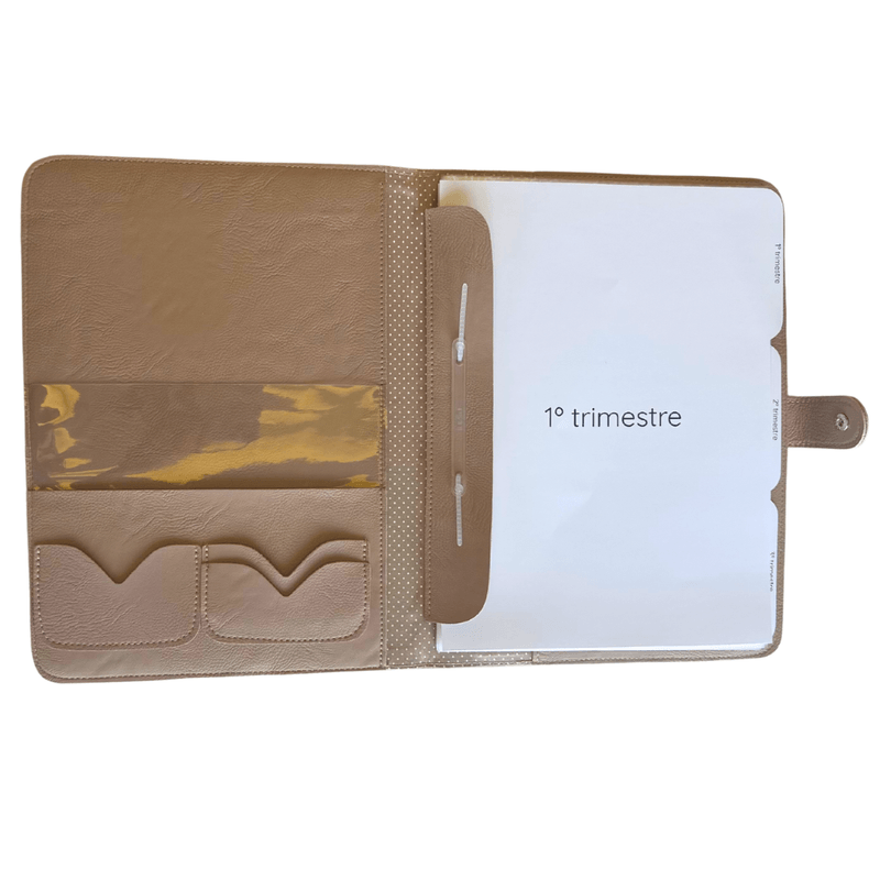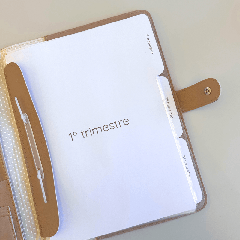 Desenvolvida para a rotina da gestante, a pasta comporta exames tamanho A4, ultrassons, receitas médicas, pedidos de exame, plano de parto, cartão do plano de saúde e documentos pessoais como CNH. As divisórias trimestrais facilitam a visualização e o acesso aos exames de cada fase da gestação.